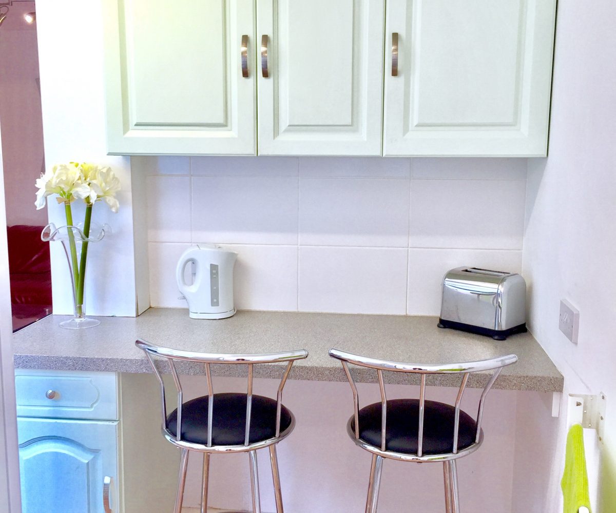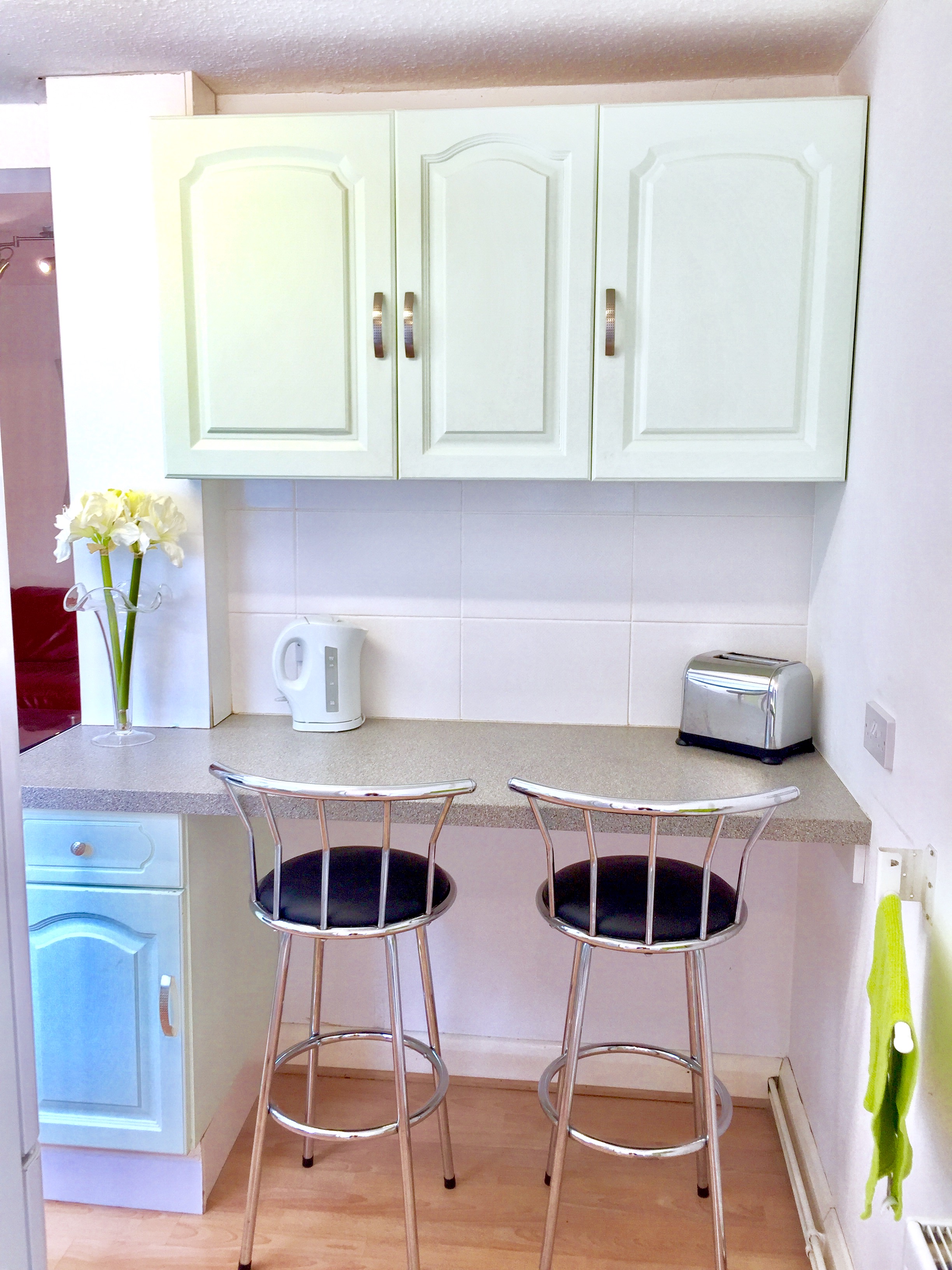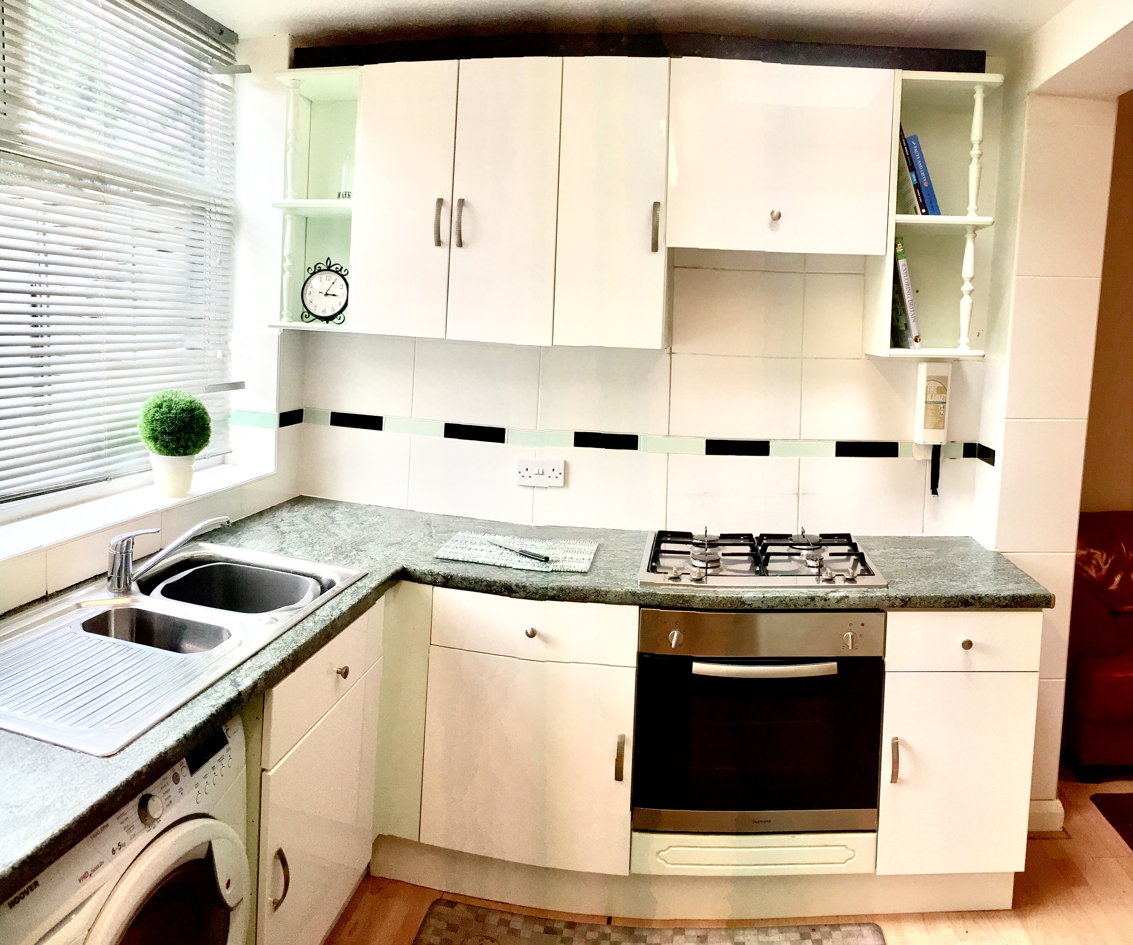 – Shared open plan modern kitchen with washer, dryer, microwave, breakfast bar
